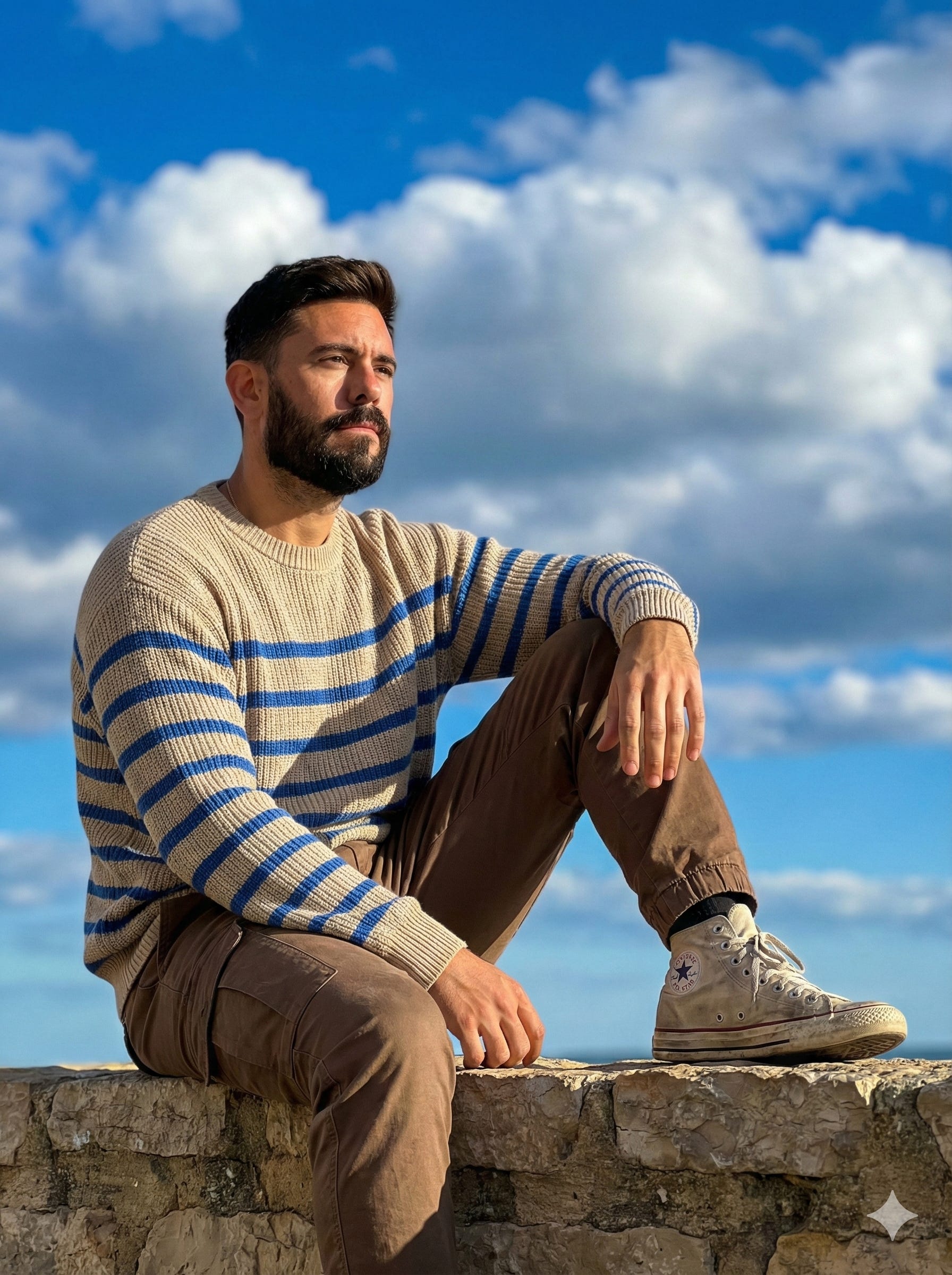 “Relax mode. Pantalones de chándal, sudadera azul, zapatillas blancas”.
